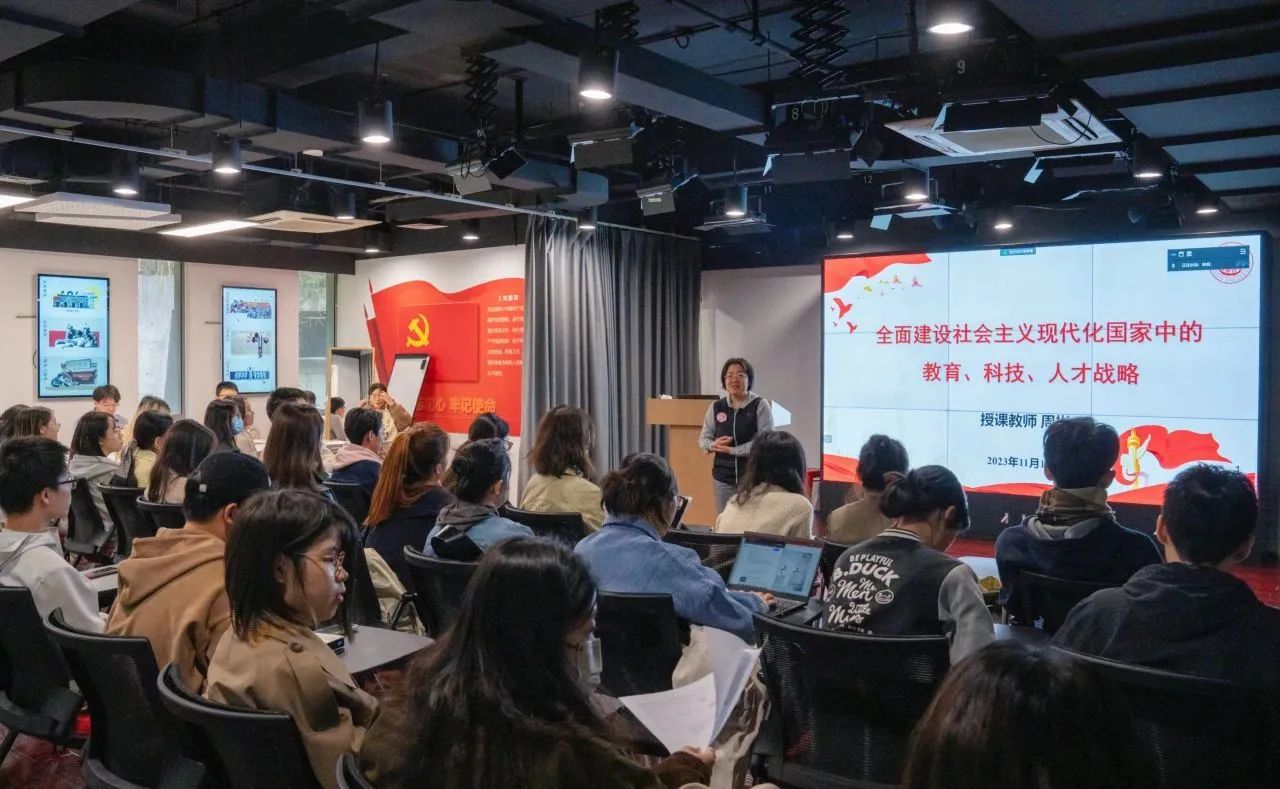 周彬老师还围绕党的二十大报告中所提的“加快建设教育强国、科技强国、人才强国”等内容进行了重点讲解,带领在座师生共同把握了解教育、科技、人才的内在逻辑,共同把认识教育、科技、人才的多重系统集成功能,共同理解以习近平同志为核心的党中央对“教育、科技、人才”三位一体进行统筹安排。期间,周彬老师还引用相关数据并分享了自身受教育经历,为在座师生深入讲解分析了我国教育领域发生的深层次、高质量变革,也更为具化地加深了在座师生对科教兴国战略的理解,进一步坚定了教育自信、文化自信。