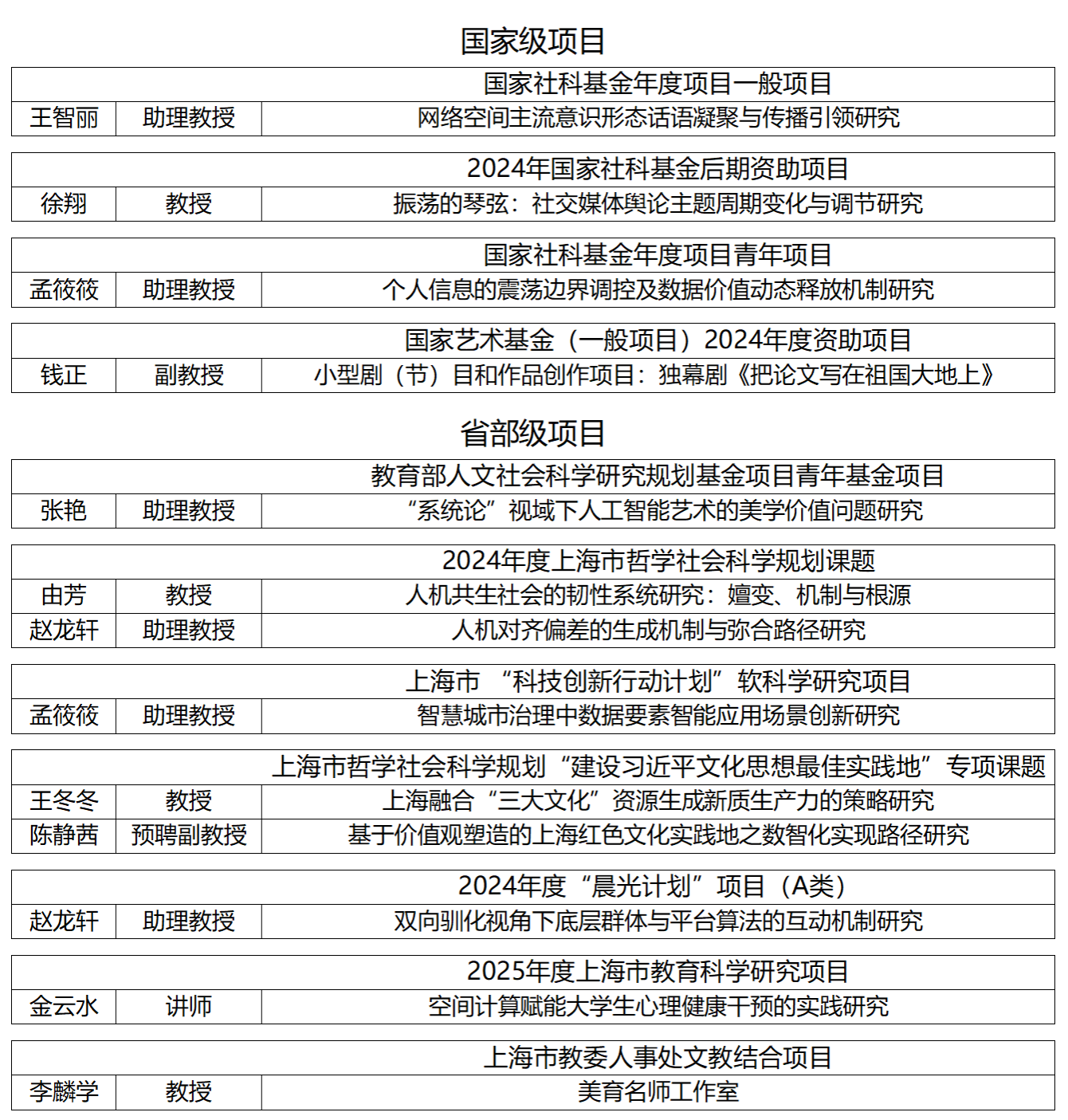 2024,全国哲学社会科学工作办公室、国家艺术基金管理中心、教育部社科司、上海市哲学社会科学规划办公室、上海市科学技术委员会等陆续公示了国家社科基金、国家艺术基金、教育部人文社会科学研究规划基金年度项目、上海市哲学社会科学规划“建设习近平文化思想最佳实践地”专项课题、上海市“科技创新行动计划”软科学研究项目、上海市哲社专项、“晨光计划”、上海教育科研、市教委文教结合立项名单。公司斩获佳绩,骨干教授、副教授和助理教授的教师团队在本年度科研项目评选中脱颖而出,共获得4项国家级、9项省部级项目立项,充分展示了公司的科研潜力和蓬勃生机。